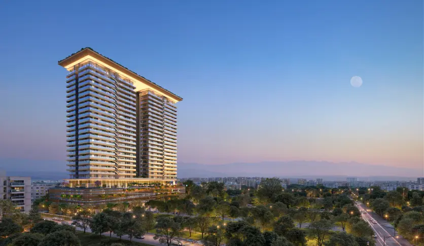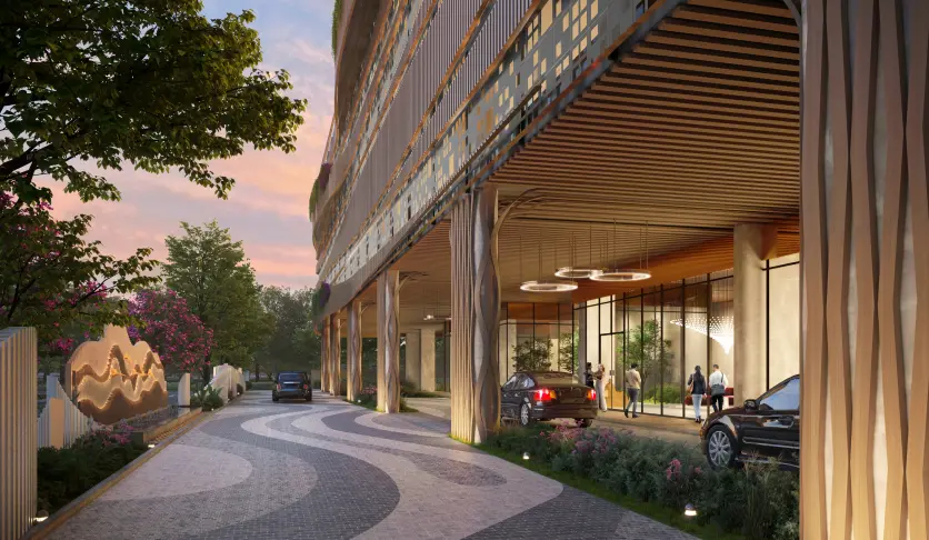 Rising 27 stories above the ground, TREVOC Royal Residences is a marvel of modern architecture. The twin towers, connected at the top, offer breathtaking views from every angle. The wave-inspired façade at the podium level adds a striking visual element, while the use of aluminium perforated sheets ensures a flawless finish. With residential floors beginning 80 feet above ground, the design promises an elevated living experience from the moment you step inside.